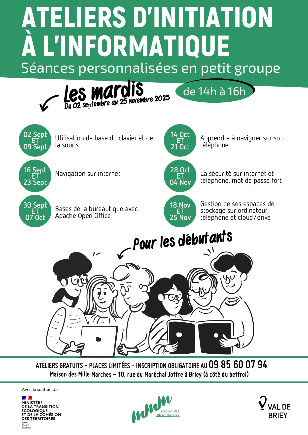La Maison des Mille Marches vous propose des ateliers d’initiation à l’informatique les mardis du 2 septembre au 25 novembre 2025 de 14h à 16h.