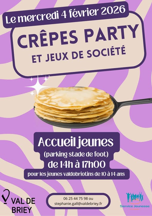 Le service Jeunesse de Val de Briey organise une Crêpes Party avec jeux de société le mercredi 4 février 2026. Pour les jeunes Valdobriotins de 10 à 14 ans.