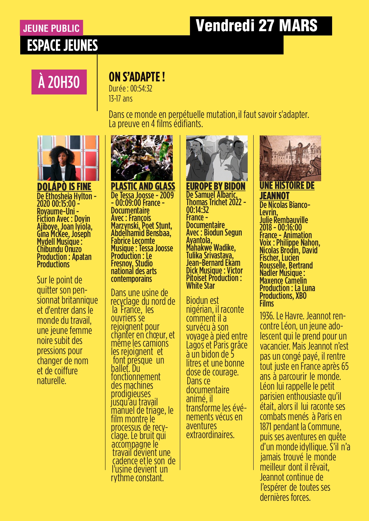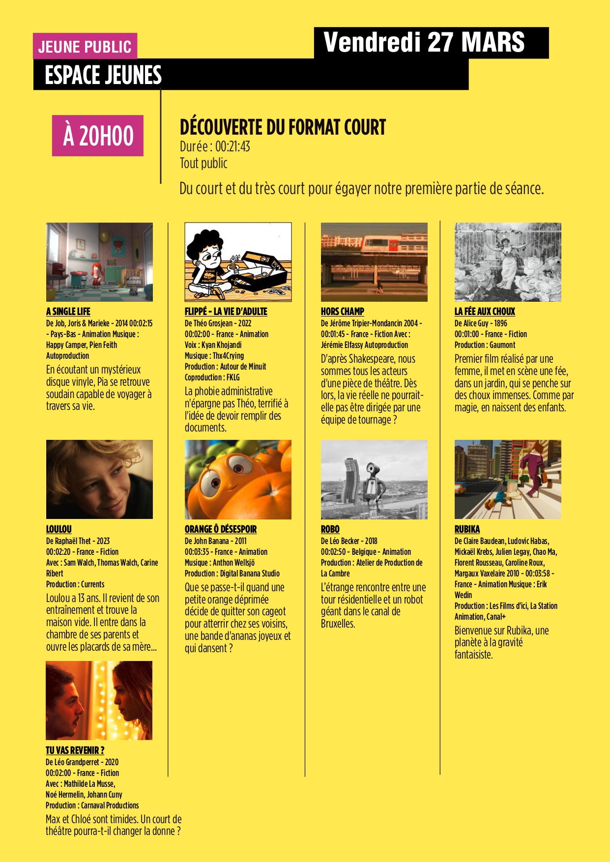 A l’occasion de la Fête du court-métrage, le Service Jeunesse organise une soirée projection le vendredi 27 mars à partir de 20h à l’Accueil Jeunes, rue Olivier Drouot (Parking du stade de foot) à Briey.