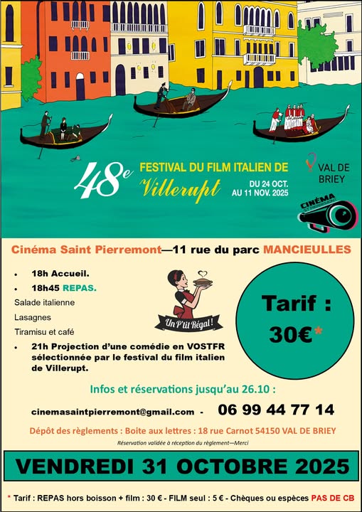 Fort du succès des précédentes soirées, le Cinéma Saint Pierremont – Mancieulles sera cette année encore, un lieu de décentralisation du 𝐅𝐞𝐬𝐭𝐢𝐯𝐚𝐥 𝐝𝐮 𝐟𝐢𝐥𝐦 𝐢𝐭𝐚𝐥𝐢𝐞𝐧 𝐝𝐞 𝐕𝐢𝐥𝐥𝐞𝐫𝐮𝐩𝐭. Rendez-vous le vendredi 31 octobre pour une soirée 100% italienne :