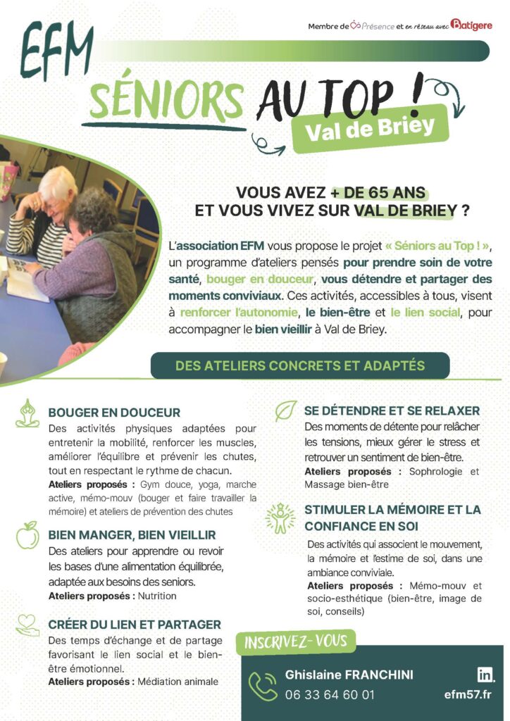 L’association EFM propose des ateliers adaptés et conviviaux pour :